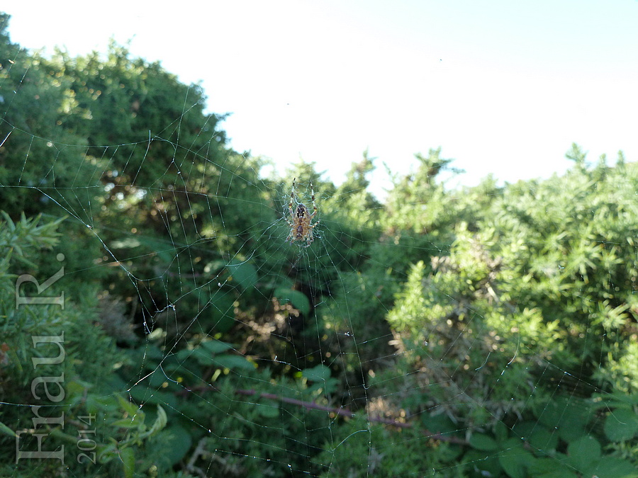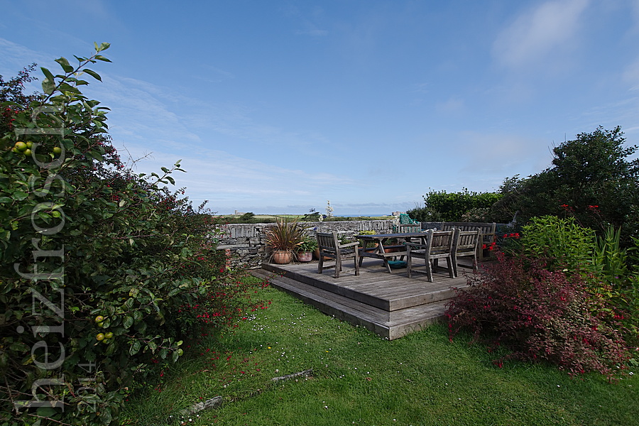 Das Cottage selbst ist kein junges Gebäude, aber ziemlich gut aufgerüstet mit neuer Küche, neuem Bad etc. Ein wenig muffig, wegen der alten Mauern und des feuchten Seeklimas. Deshalb erste Amtshandlung: Durchlüften! Was wir von unseren dänischen Ferienhäusern nicht mehr kennen, ist die Aufteilung in viele kleine Zimmer. Wir haben eine Küche, ein Bad, ein Esszimmer, ein Fernsehzimmer, drei Schlafzimmer auf zwei Etagen und am Ende des Tages nicht mehr unbedingt und immer die Übersicht. Die einfache Antwort »Hier!« auf die Frage »Schatz, wo bist du?« haben wir uns deshalb schnell abgewöhnt. Ausgeräumt wird deshalb nur das Nötigste, weil wir endlich etwas zu essen brauchen und außerdem noch ein Highlight des Hauses nach uns ruft: ein herrlicher Garten mit Terrasse zur Küste. Dort verbringen wir noch einen kleinen Teil des Abends lesend, denn für einen Spaziergang reicht die Kondition sowieso nicht mehr. Dafür werden wir äußerst euphorisch von unseren direkten Nachbarn begrüßt: Eine Hühnerschar rennt auf Herrn H. zu. als der sich kurz über die Mauer zur gegenüberliegenden Wiese beugt. Ein paar Hasen hoppeln etwas entfernt auch über das Grün. Sehr lauschig! Und es gibt jede Menge Spinnen im Garten, die teilweise sogar das Mobiliar eingesponnen haben. So mag ich die Natur.