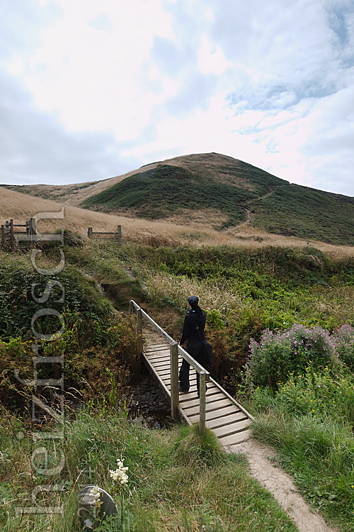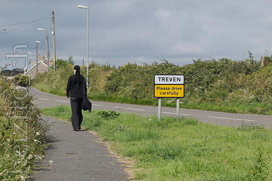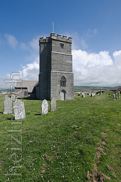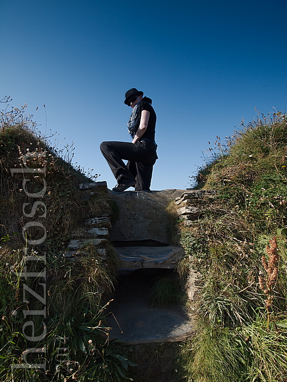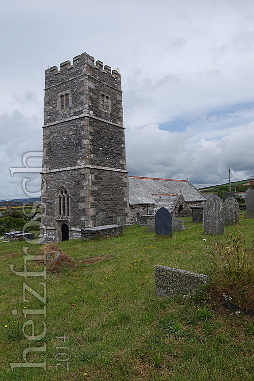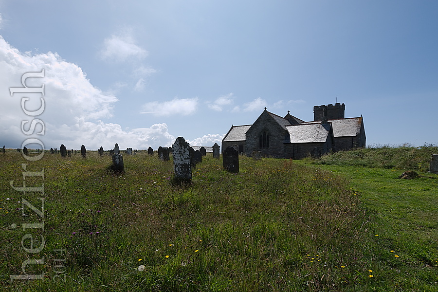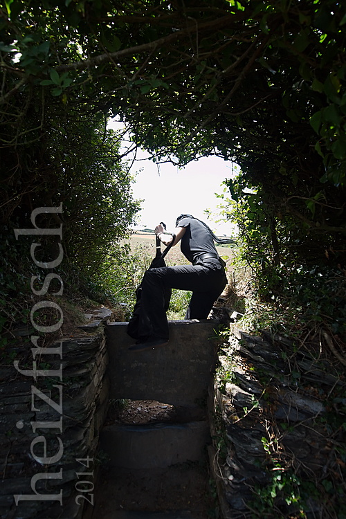 Für uns heißt das: wieder steile Stufen runter. Dann folgen wir dem Talverlauf, erfreuen uns an der lauschigen Umgebung, sehen die Ruinen einer alten Mühle, landen am Ende des Tals auf der Landstraße und merken, dass wir hier eigentlich gar nicht ankommen wollten. Denn wir haben eine Abkürzung genommen, die wir ursprünglich für den Rückweg gehen wollten. Egal – ein paar Hundert Meter hügelhoch finden wir einen Stein, den angeblich King Arthur von Tintagel aus dahin geschmissen haben soll (na klar …), kurz danach geht es wieder küstenwärts zu St Petroc’s, einer kleinen Dorfkirche in Trevalga. (Übrigens fangen hier fast alle Nester mit »Tre« an, was kein Wunder ist, da Tre in Keltisch soviel wie »Ort« oder »Platz« heißt; wir selber wohnen in Treven, um die Ecke liegen Tregatta, Trevillick, Treknow, Trelake, Trewarmett, Trewethet, Trethevey … Der Orientierung ist das für Ortsfremde nicht unbedingt dienlich, aber das nächste Tre… ist meist auch nur eine halbe Meile entfernt.) Von dort laufen wir zum Fern Tor, dann am Horse Pool, Firebeacon Hill, Lady’s Window und anderen vielen tollen Hügeln und Aussichtspunkten vorbei, um irgendwann kurz vor der Schreigrenze wieder das Rocky Valley zu erreichen – durch welches wir auf dem Weg zum Auto nochmal durch müssen, was erneut viele Stufen runter und auf der anderen Seite hoch bedeutet. Frau R. entdeckt kurz vor Bossiney eine Abkürzung, soll heißen: Wir folgen einem Querfeldein-Trampelpfad. Die letzten Meter ziehe ich mich mit den Zähnen durch den Rasen, und ich habe selten meine Kameraausrüstung lustvoller ins Auto geworfen …