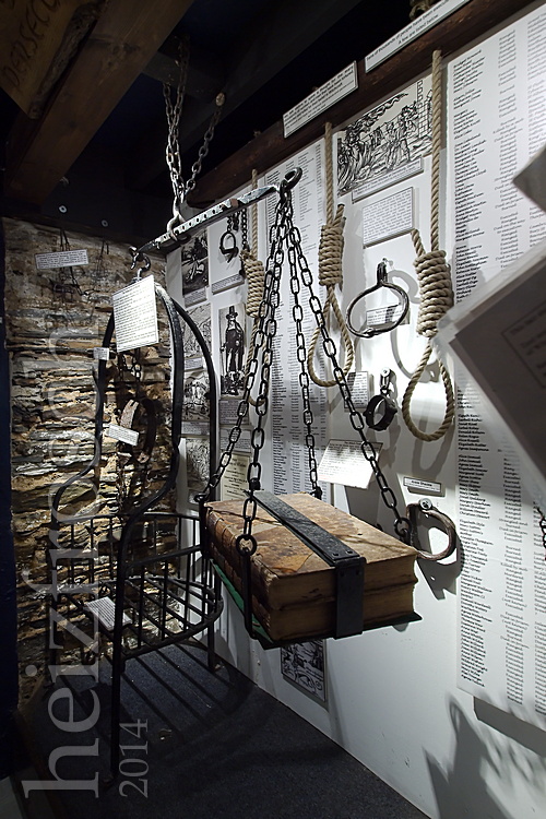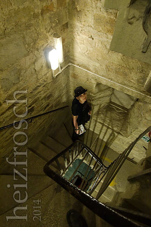 Wir lesen dutzende putzige Tafeln mit allerlei Verbrechergeschichten und Missetaten, sehen Tabellen mit gewichtsabhängigen Fallhöhen für den Tod durch den Strick (the long drop, also 8 Fuß galten als recht zuverlässiger Wert für durchschnittliche Männer; die letzte Hinrichtung durch Erhängen fand in England 1964 statt; alle Henker sind übrigens per Fotowand dokumentiert), erfahren, dass man früher eine Frau, die man nicht mehr brauchte, für ein paar Pennies auf dem Viehmarkt verticken konnte und dass das Heizungssystem des Knasts auf Erkenntnissen der Römerzeit beruht. Einige der Hingerichteten sollen immer noch in den Gemäuern spuken. Man kann sogar eine diesbezügliche Führung um Mitternacht buchen. Und nach Aussage der Moderatorin von »Most haunted« (frei übersetzt »Am verwünschtesten«) einer der gruseligsten Orte, an denen sie jemals gedreht hat. Ja, nachdem wir wenig später das »Glück« hatten, eine Folge dieser Mysterie-Dokumentation zu sehen, kann ich das verstehen: Wer sich fürchtet, weil ein wackeliger Tisch wackelt, wenn ein paar Leute ihre Hände darauf legen, wird des nächtens in alten Gefängnismauern kaum an sich halten können ;-) Noch ein paar »harte« Fakten zum Gebäude: Von 1946 bis 1972 wurde der Verwaltungsteil vom sog. The »99« Club als Nachtklub genutzt.