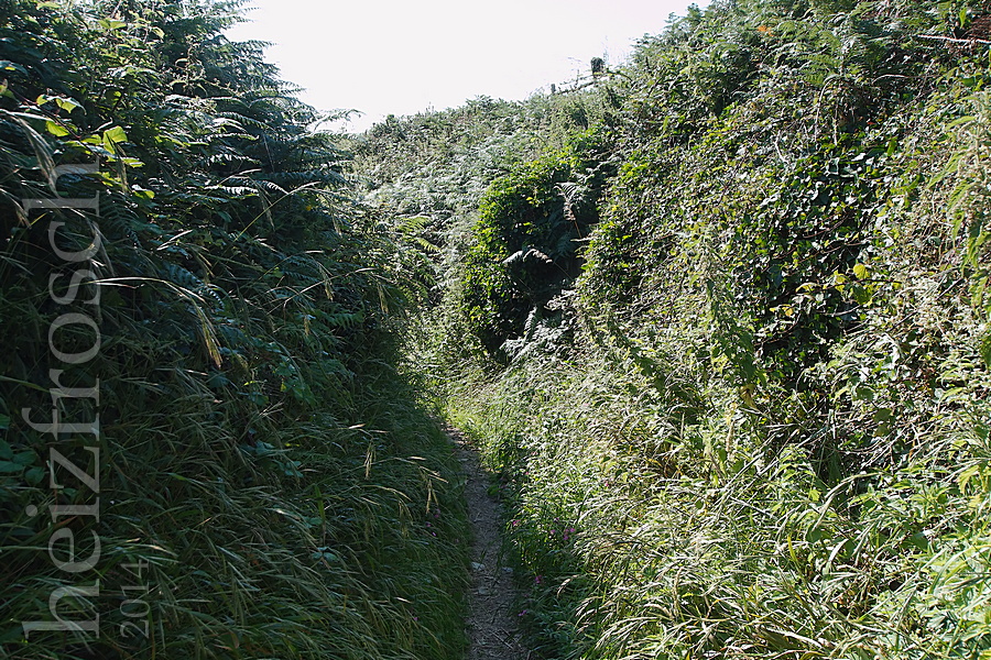 Die Pläne für Wir-kippen-kurz-die-Einkäufe-im-Haus-ab-und-laufen-noch-eine-kleine-Runde lasse ich auf dem Rückweg von Tintagel fallen. Die Sonne brennt einfach zu sehr herunter, und ich will erstmal in den Schatten. Der Spaziergang verschiebt sich deshalb um ca. 2 Muffins, eine Tasse Kaffee und ein paar Buchseiten. Gegen 16.30 Uhr fühle ich mich fit genug, und wir wandern nach Treknow und von dort zur Steilküste über Trebarwith Strand. Und obwohl ich auf dem Küstenpfad mehrfach »Ich bin einfach zu alt für diese Sch…« denke, wird das ein wunderbares Naturerlebnis, denn die Buchten entlang der Atlantikküste sind einfach atemberaubend! Also ich muss jetzt mal energisch für Herrn H. sprechen: Dieser Teil Englands ist nicht flach, sondern bei Küstenwanderungen führen die Pfade auch durch Täler. Es geht also bergauf und bergab; und das teilweise in nicht zu unterschätzenden Steigungen! Wenn dann noch die Sonne die Temperaturen auf gefühlte 30 Grad bringt und die hohe Luftfeuchtigkeit ihr Übriges tut, dann ist es nicht verwunderlich, wenn ein nicht hitzeresistenter Organismus in den Streik tritt.