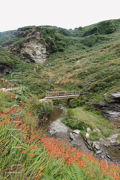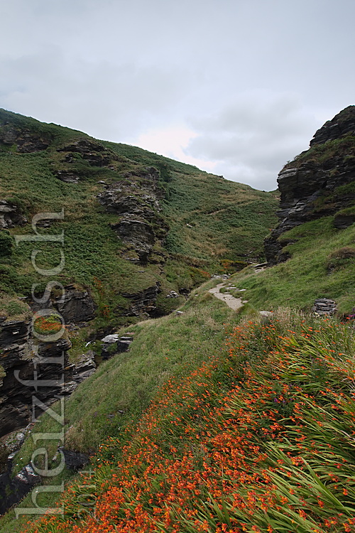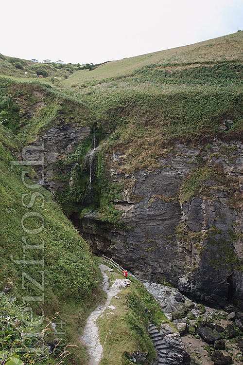 Genug, jetzt wieder hoch den Hügel. Die Stiegen werden wahnwitziger. Doch das Halteseil hält! Oben angekommen strawanzeln (danke an Thomas J. Hauck für dieses Wort!) wir oberhalb der Steilküste entlang in Richtung Rocky Valley. Das ist ein zauberhaftes Tal, in welchem sich der Fluss, der in St Nectan’s Glen den Wasserfall runterrauscht, am Ende mit dem Atlantik vermählt.
