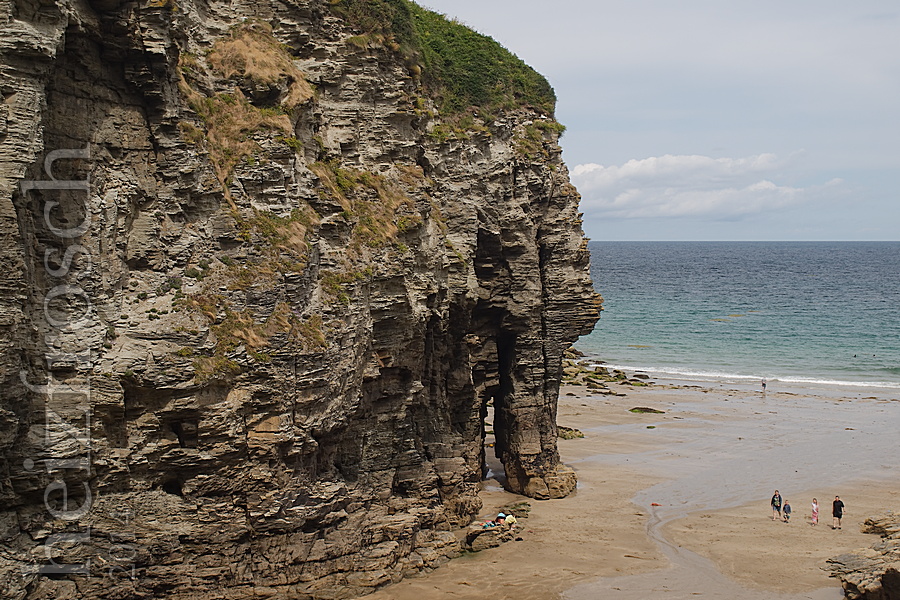 Wir starten vorsichtig und fahren mit dem Auto ganze 5 Minuten bis Bossiney (eigentlich albern, aber am Ende des Tages werde ich feststellen, dass ich die 4–5 km mehr bis nach Hause keinesfalls mehr hätte laufen wollen; und weil ich – aus der Erfahrung des gestrigen Tages mit meinem kleinen Abstecher Richtung Bossiney – in weiser Voraussicht dazu geraten hatte). Dort stechen wir direkt in Richtung Strand, also steinige Stolperstiegen runter. Denn es ist gerade Niedrigwasser und in die Bucht bewanderbar. Der Tidenhub hier fällt ziemlich stark aus, und bei Flut steht der Strand ein paar Meter unter Wasser. Wir sehen den Elephant Rock (so benannt, weil der Felsen die Form eines Elefantenkopfes hat, der bei Ebbe so aussieht, als ob er trinkt), werfen einen Blick in diverse Höhlen, suchen Muscheln und finden keine, und um uns herum tobt englisches Beach Life. Es wird Ball gespielt, Hunde freuen sich wie doof über den Auslauf, und allenthalben sieht man Picknickausrüstungen. Herr H. ist beim Fotografieren kaum zu bremsen und deshalb »vertrödeln« wir bei Wanderpunkt 1 und 2 schon eine Stunde.