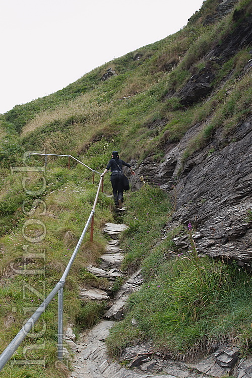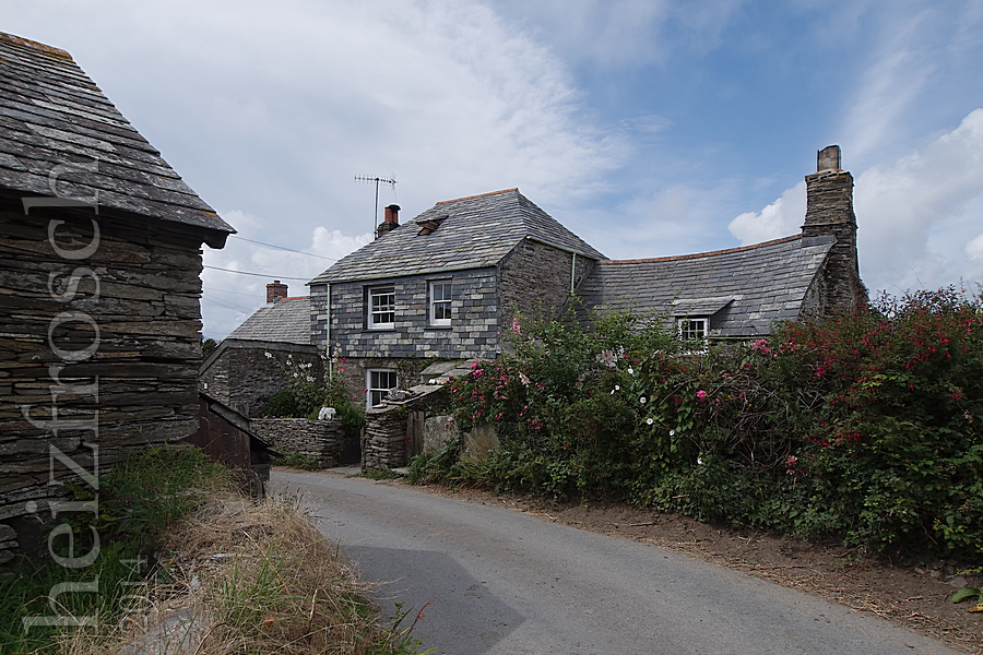 Wir schlafen seeehr lange und gut. Das Frühstück zieht sich, und so brechen wir erst gegen 14 Uhr zu einem Fußmarsch durch die Gegend auf. Tintagel liegt wie gesagt nur ca. eine Meile weit weg und ist schnell durchlaufen. Wir sammeln in der Touristeninfo Touristeninfos ein, entnehmen dem Geldautomaten ein paar Pfund, ersparen uns den Weg zu King Arthur’s Castle und biegen stattdessen in die Straße zum Vicarage Hill ab. Dort erwischt uns ein kleiner Regenschauer, aber Frau R. ist vorbereitet und zückt den Schirm. Das Wetter in Cornwall ist als sehr sprunghaft bekannt – man sollte im Sommer keinesfalls verblüfft sein, dass es mehrfach täglich recht warm und sonnig sein kann, ein paar Minuten später kurz wie aus Kannen gießt und anschließend der Himmel wieder strahlt. Windbreaker oder Schirm sind deshalb nie eine schlechte Idee, wenn man Nässe vermeiden will.