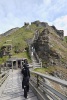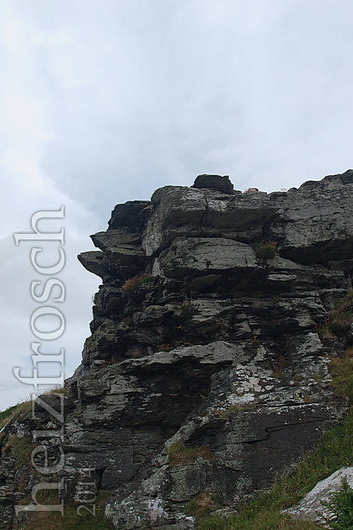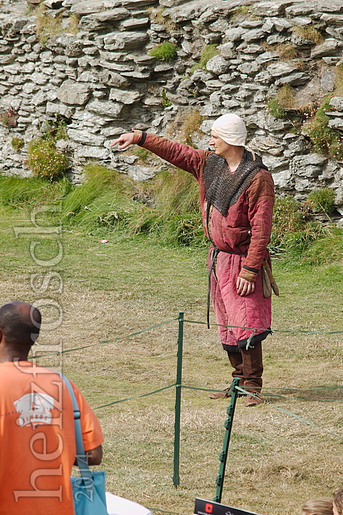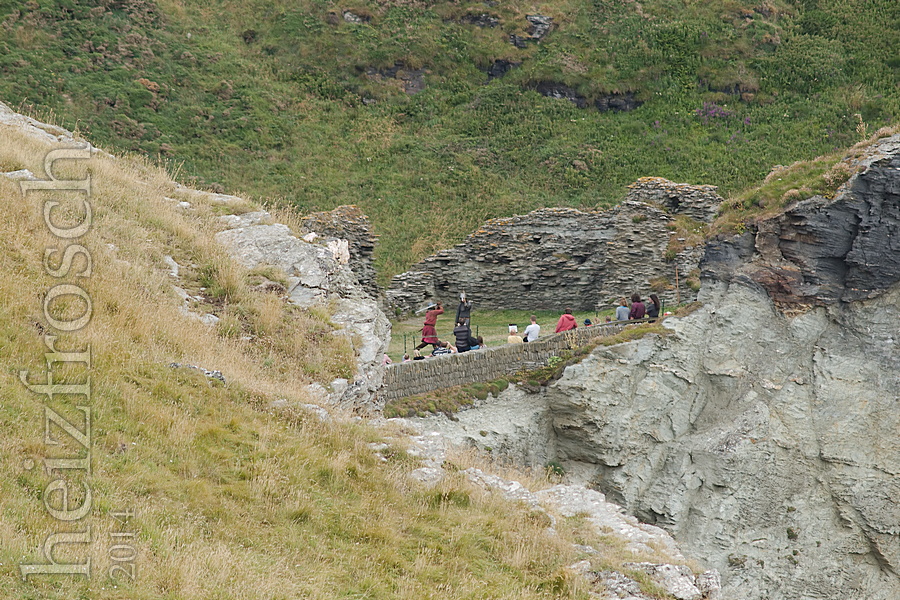 Na gut, na schön – wenn man schon mal da ist, dann kann man sich Tintagel Castle (oder Castel Dyntagell in der Landessprache) auch anschauen. Zumal wir keine Lust auf lange Touren haben, das Ding gleich um die Ecke liegt und von heute bis Donnerstag auch ein bisschen Kulturprogramm geboten wird (Kinderhauenundstechen, Troubadouremeucheln, Ritterschlachten, Artilleriegemetzel, und das alles im stündlichen Wechsel). Für 7,10 Pfund Eintritt pro Nase gehört die Insel uns und ein paar Dutzend anderen Spaßsuchenden. Vorher stechen wir aber noch zum Strand ab; Frau R. war da schon am letzten Samstag und will Steine sammeln sowie mir die Höhle zeigen, in der Merlin gewohnt haben soll, aber höchstwahrscheinlich nicht hat, weil sie bei Flut ziemlich heftig unter Wasser steht. Noch ein paar Anmerkungen zur Schlossruine: Der Legende nach stand auf dem Felsplateau die Festung von König Gorlois, dem Ehemann von Ygerna. Diese wiederum wurde von König Uther Pendragon begehrt. Merlin hat Uther so verwandelt, dass er wie Gorlois aussah. In einer nebeligen Nacht, natürlich auch von Merlin produziert, ging Uther als Gorlois zu Ygerna und zeugte in dieser Nacht mit ihr Arthur. Allerdings wurde Arthur nicht von Ygerna aufgezogen, sondern von Ector. Und nach dem Tod von Uther kam dann das Ding mit dem Schwert im Stein, natürlich dort von Merlin platziert. Ob König Gorlois tatsächlich in Tintagel residierte, lässt sich nicht nachweisen. Auf Grund der archäologischen Funde weisen Leben und Herrschen vom 5. Jh. bis zum 13. Jh. nach. Und das ist doch allemal bemerkenswert!