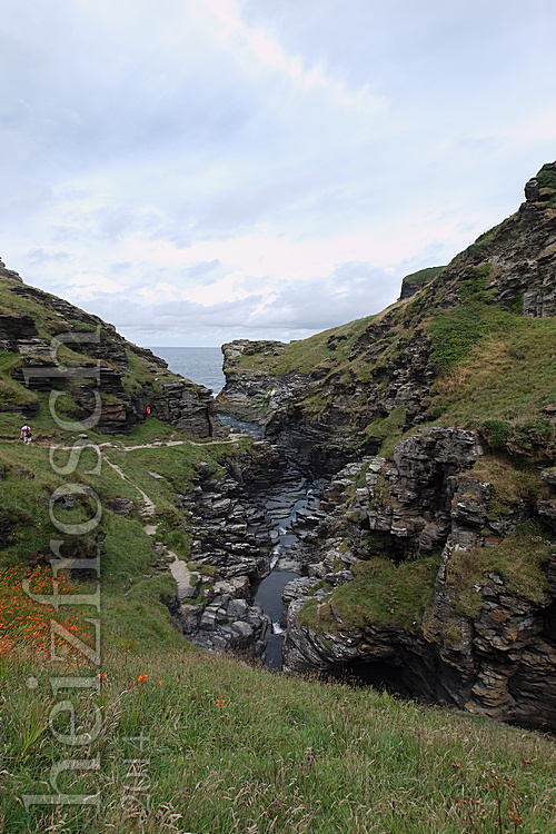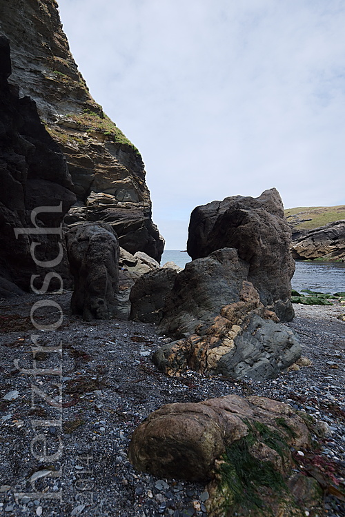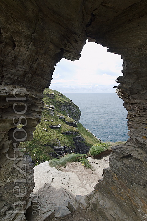 Heute war es dann soweit: Wir haben uns getrennt! Herr H. wollte unbedingt eine ausgedehnte Fototour machen und ich … na ja, ich eben nicht! Damit wir beide einen Tag nach unserem Geschmack verbringen können, entschieden wir uns für unterschiedliche Ziele. Ich wollte die Ebbe ausnutzen, um endlich ein paar Steine zu sammeln. Das Wetter sagte Bewölkung und um die 23 Grad voraus. Nun, in der Sonne waren’s gefühlte 30, im Schatten und mit Küstenwind gefühlte 18. Der geübte Küstenwanderer – also in dem Fall ich – zieht sich deshalb nicht allzu freizügig an, trägt reichlich Sonnenschutz auf und bedeckt sein Haupt mit einer Kappe oder einem Hut (der Engländer hat da äußerst absonderliche Modelle im Angebot ;-) ). Ich beginne meinen Rundgang mit einem Bogen: Durch Tintagel durch, bis zum Hotel und dann Richtung Bossiney. Auf etwas verschlungenen und nicht immer vom National Trust angelegten Pfaden komme ich auf ein Felsplateau, von wo man einen fantastischen Ausblick über die Steilküste und den Atlantik hat! Hierher verirren sich auch nicht so viele Menschen. Die sind alle in den Ruinen von Tintagel Castle, wie ich von meinem Aussichtspunkt gut erkennen kann. Ich bleibe ein paar Augenblicke sitzen und genieße den Augenblick. Und wer genau hinschaut und sich Zeit nimmt, sieht auch die scheinbar unscheinbaren Dingen. In meinem Fall war das ein Stück Eidechsenhaut. Der Tidenplan, den wir gestern in der Touristeninformation gekauft haben, sagt für heute Vormittag 11.56 Uhr Ebbe an; für Nachmittag ist er sich noch nicht so ganz schlüssig und macht keine Angaben. Also flugs hinunter zur Merlin-Höhle! Noch sind Menschen am schmalen Steinstrand und ich sehe auch Leute aus der Höhle kommen. Gott sei Dank wollen die meisten Touristen erst mal zu den Schlossruinen. (Tipp für den Reisewilligen: So es sich vermeiden lässt nicht am Wochenende nach Tintagel fahren! Wegen der Arthus-Vermarktung ist hier die Hölle los.) Und ich bin wiedereinmal erstaunt, über die deutsche Rentnerschar, die mit einem Reisebus abgeladen wurde. Hoffentlich hat der Veranstalter vorher einen Fitnesstest gemacht, denn es geht ordentlich bergauf und bergab auf dem Schlosshügel. Und die Wege sind oft steinig und uneben. Mir macht es auch nichts aus, steile Treppen hoch zu steigen, bis mir die Lungen brennen. Aber wenn man um die Mitte 70 ist, kann so etwas zur aktiven Aufgabe aller Funktionen der künstlichen Hüfte führen. Da das aber nicht mein Problem ist, begebe ich mich zur Küste. Es ist ein sehr kleiner, steiniger Strandabschnitt, der nur bei Ebbe erreichbar ist. Eine Erklärtafel weist darauf hin, dass sich vor ca. 1.500 Jahren hier ein Hafen befand. Und es wird vermutet bzw. behauptet, dass in der großen Höhle Merlin gehaust haben soll. Also wenn das stimmen soll, dann war entweder bei Flut der Wasserstand noch nicht bei 6,4 m (dann ist die Höhle nämlich völlig unter Wasser) oder olle Merlin kannte einen Zauber, um seine Höhle trocken zu halten. Egal! Eindrucksvoll ist die Höhle allemal. Und endlich kann ich meine Füße in Atlantikwasser halten. Es ist schön warm, obwohl die kreischen Kindern so tun, als ob es eisig wäre. Muscheln gibt es leider nicht. Ich finde lediglich das Gehäuse einer Kegelschnecke. Die Auswahl an Steinen ist enorm. Den Rückweg mit steilem Aufstieg bedenkend, fülle ich nur eine Tüte. Als dann eine Reisegruppe polnischer Jugendlicher den Strand stürmt, wird es mir zu laut und zu voll. Also Rückzug. Übrigens kann man sich gegen einen Obolus von der Küstenwache wieder nach Tintagel (natürlich auch den Weg zum Schloss) mittels Range Rover chauffieren lassen. Aber faul kann ich auch zu Hause sein! Trotzdem bin ich froh, mit den 2 kg Steinen im Gepäck den Anstieg hinter mich gebracht zu haben. Und dann nichts wie zurück ins Ferienquartier zu Keksen und Tee. Der Nachbar bastelt schon wieder etwas, die Hummeln und Bienen summen, die Hühner dösen im Schatten – hach, wie herrlich!