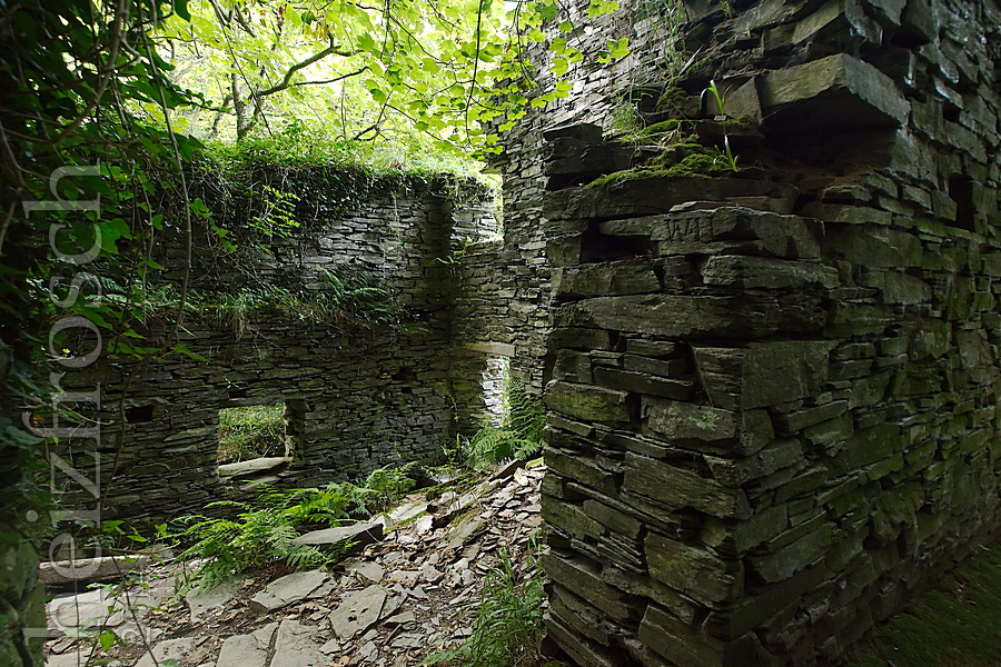Eine Ruine abseits der Straße lenkt mich jedoch vom Ziel ab, und ich beschließe einen Abstecher. Seltsamerweise lässt sich die Entfernung nicht genau abschätzen, weil ich nicht weiß, wie groß die Ruine ist, und weil es auch keinen direkten Weg dorthin gibt. Ich schlunze einfach querfeldein, es mögen so etwa 500 m vom Hauptweg gewesen sein. Solche Ruinen stehen hier allenthalben herum. Manche sind alte Gehöfte, manche waren Minen. Sie gehören einfach zu Cornwall.