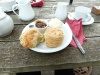 Wir folgen seinen Spuren, latschen von der Kirche über die Felder zum Cliff, setzen uns in die Hütte, rauchen nichts (wir hätten besser vorbereitet sein sollen ;-)) und genießen die fantastische Aussicht. Der Spaziergang führt uns danach weiter entlang an der malerischen Küste, wobei Frau R. Teile der Abstecher verweigert. :) Manchmal ist es eben einfach schöner, wenn man NICHT dem fotografierbessenen Ehemann an jede Klippe folgt, sondern sind ganz gemütlich auf einen Stein setzt, die Insekten der Umgebung beobachtet und die Seele baumeln lässt! Die Suche nach einer Abkürzung zurück nach Morwenstow endet nach einem Gespräch mit Einheimischen erfolglos. Da deren Hund offensichtlich den Weg zum nächst gelegenen Pub kennt – oder darauf abgerichtet ist – schlagen wir ebenfalls die Richtung ein, die das Paar nimmt. Also folgen wir der offiziellen Wanderempfehlung und pfadeln entlang eines lauschigen Baches bergan, kreuzen später einen recht mystisches Waldstück (so schön wie der Weg zum St Nectan’s Glen, nur ganz ohne andere Touristen; Feen scheinen auch zu fehlen) und spicken am Ende quasi direkt und ohne Chance auf Gegenwehr in die Rectory Tearooms, eben jenen Gasthof, neben dem sowieso unser Auto parkt. Und weil wir schon mal da sind, gönnt sich Frau R. einen echten Cornish Cream Tea (eine Kanne Tee, zwei Scones (Scones sind eine Art Brötchen, die warm verzehrt werden. Die besondere Konsistenz der Scones entsteht durch die Zugabe von Eiern und süßer Sahne und durch die vorsichtige Vermischung der Zutaten.) mit Clotted Cream (auch Streichrahm ist eine Art dicker Rahm, der aus roher Kuhmilch hergestellt wird. Die Milch wird in flachen Pfannen erhitzt und für mehrere Stunden stehen gelassen. In dieser Zeit sammelt sich der Rahm an der Oberfläche und bildet Klümpchen (»clots«) und Aprikosen-Ingwer-Marmelade, man kann natürlich auch eine andere Marmelade wählen), während ich mich mit einem schnöden Brownie an Vanilleeis mit Schokoladensoße und Erbeere begnüge. Haaach, lecker. Und in diesem Augenblick gibt es einfach nichts schöneres, als im Garten dieser Teestube zu sitzen und fettige Nachmittagssüßspeisen bei feinem Tee zu genießen! Putzigerweise kommen kurz nach uns ein paar deutsche Urlauber an, welche vor knapp zwei Wochen im Hotel in Calais das Frühstücksbuffet mit uns geteilt haben – möge sich jeder die Chance ausrechnen, dass so etwas passiert …